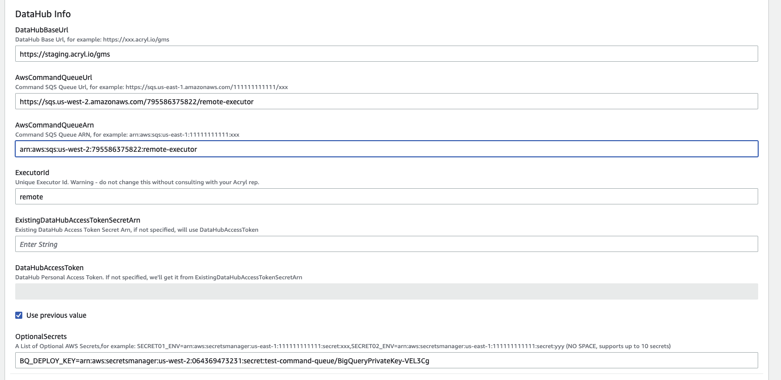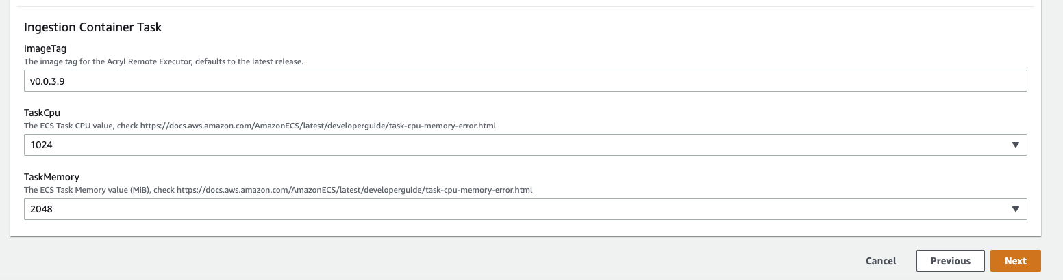 Provision an Acryl Executor (ECS): Acryl team will provide a Cloudformation Template that you can run to provision an ECS cluster with a single remote ingestion task. It will also provision an AWS role for the task which grants the permissions necessary to read and delete from the private SQS queue created for you, along with reading the secrets you've specified. At minimum, the template requires the following parameters: